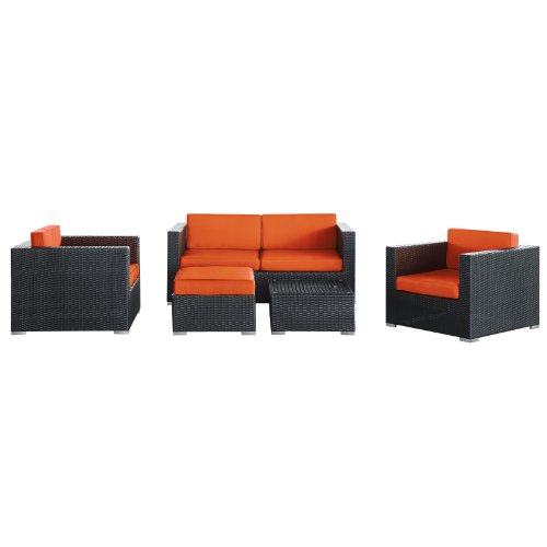 LexMod Malibu Outdoor Wicker Patio 5 Piece Sofa Set In Espresso with Orange Cushions